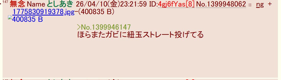 | … | 209無念Nameとしあき26/04/10(金)23:59:34 ID:4gj6fYasNo.1399956794+>No.1399956456 |