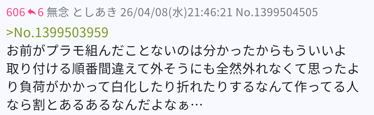 | … | 234無念Nameとしあき26/04/11(土)00:16:10 ID:o0XGQk6ANo.1399960287+プラモ制作は進んでるのかしら( ^ω^ ) |