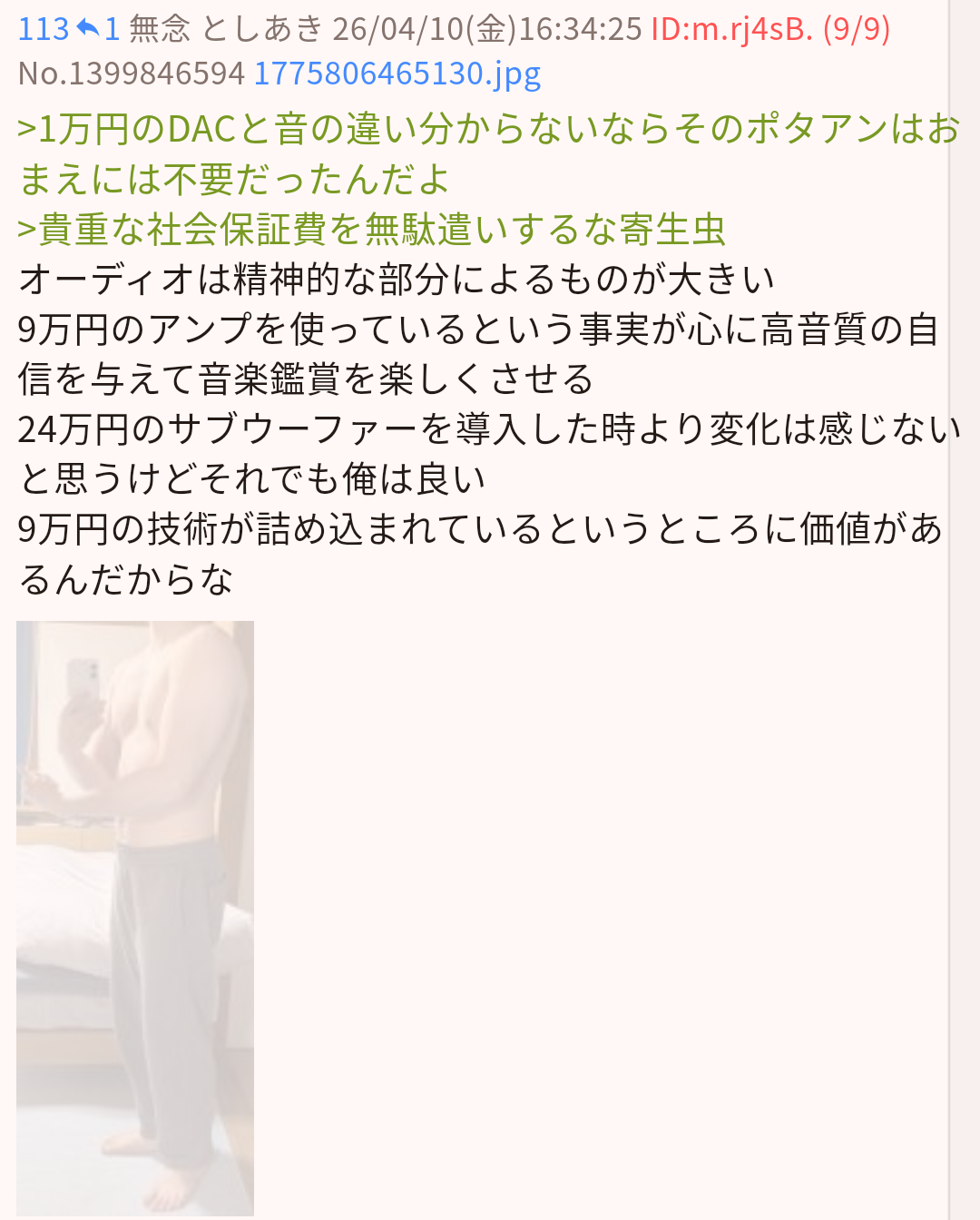 | … | 9無念Nameとしあき26/04/10(金)22:08:00No.1399926867そうだねx5オーディオスレはいいけどおっさんの半裸画像は消してくれよ |