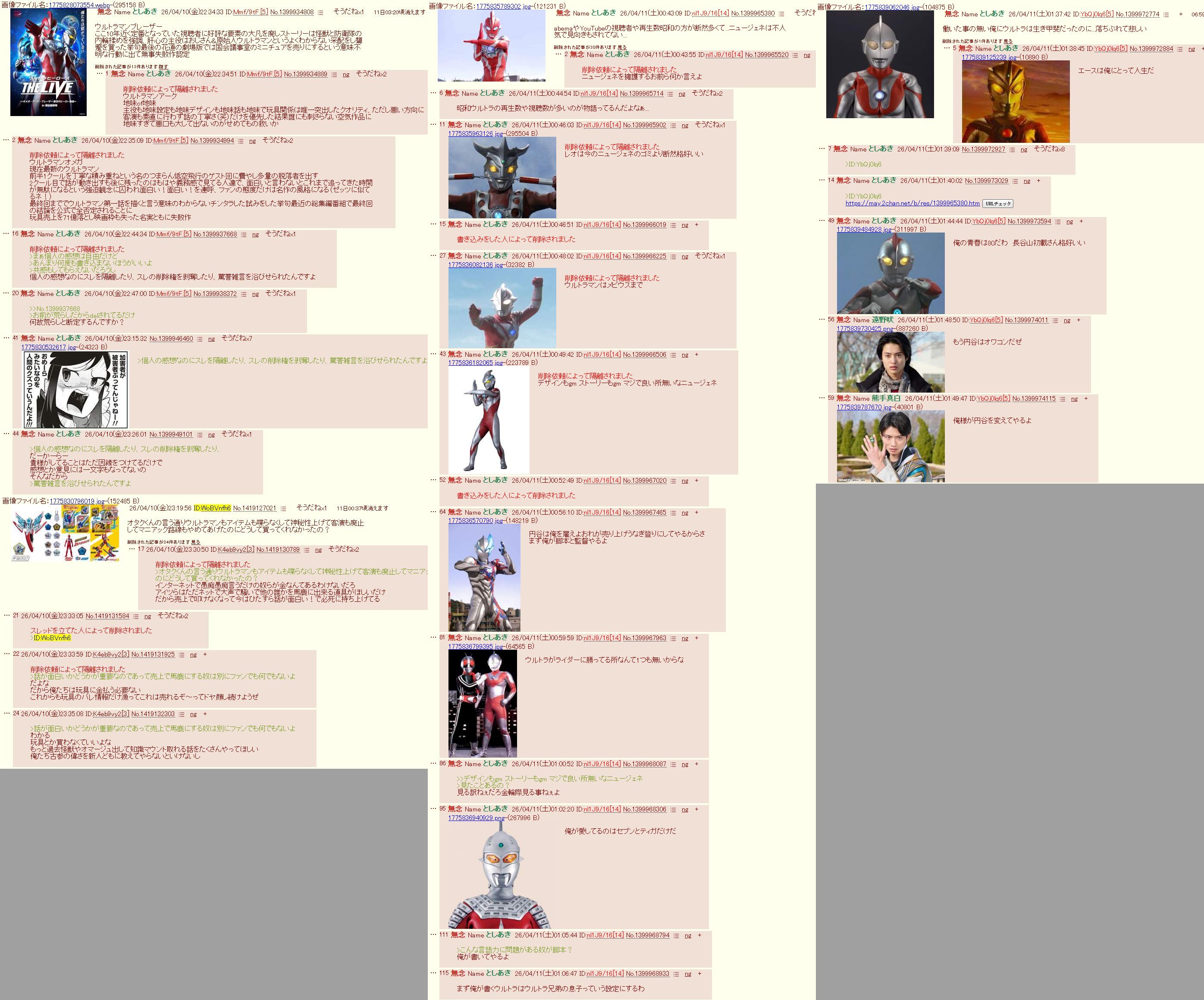 | … | 57無念Nameとしあき26/04/11(土)01:48:52No.1399974014そうだねx1>働いた事の無い俺にウルトラは生き甲斐だったのに...落ちぶれて悲しい |