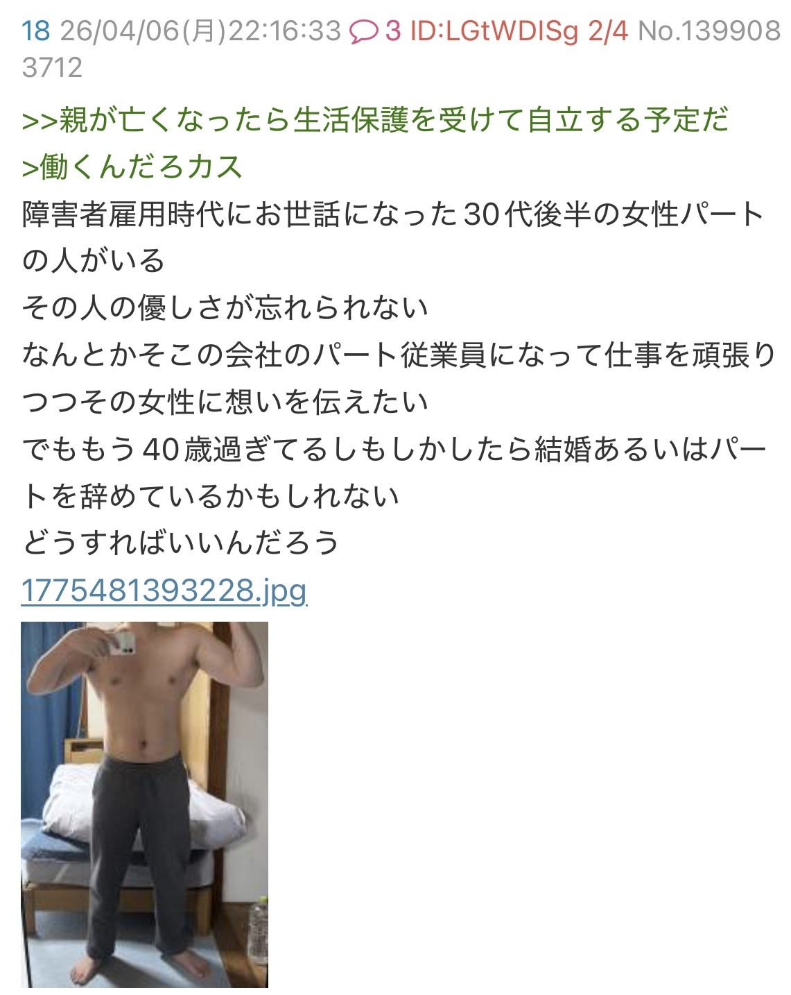 | … | 40無念Nameとしあき26/04/11(土)08:10:56No.1399993707そうだねx3>>ハロワすら行けない豚 |