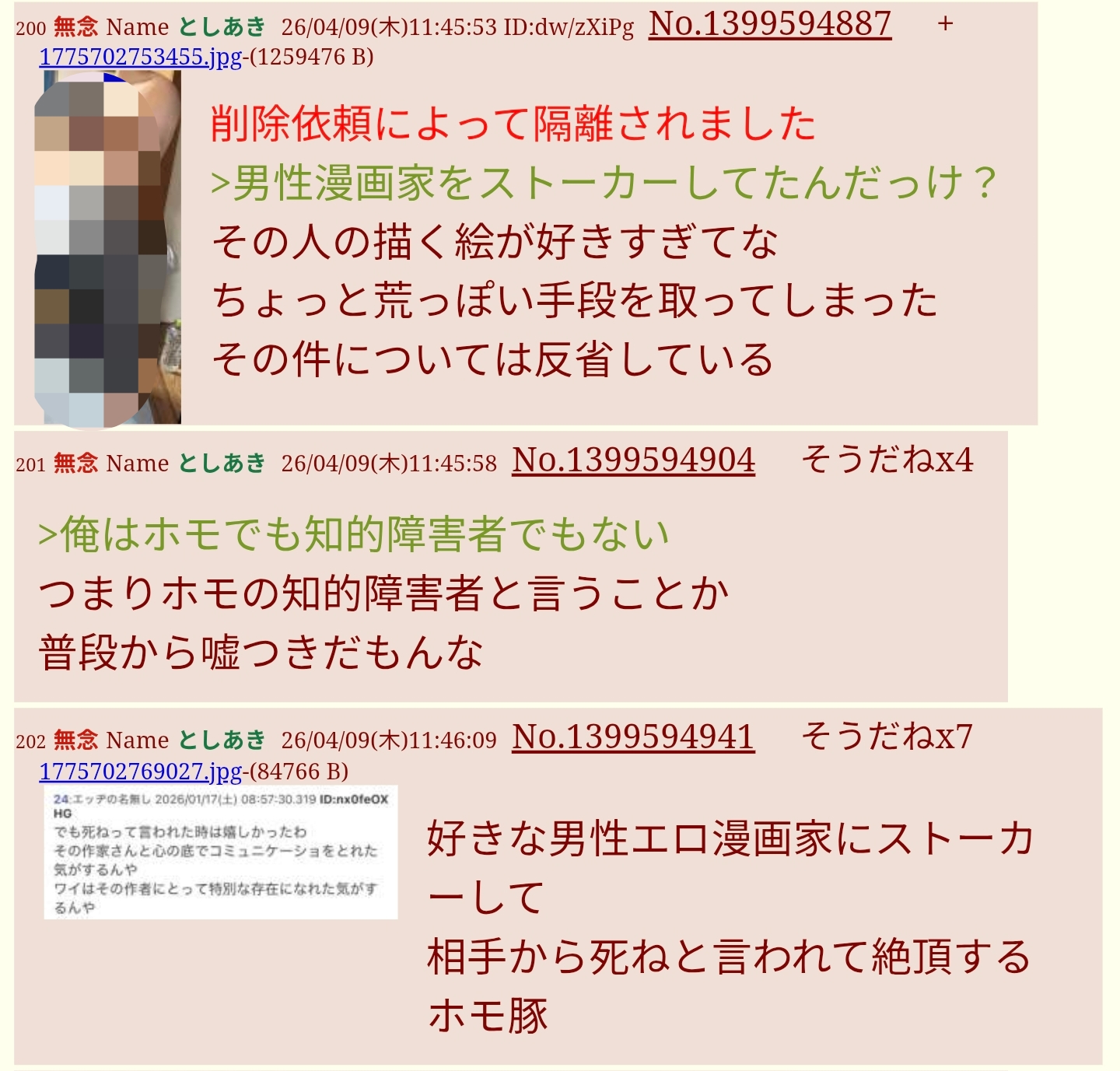 | … | 6無念Nameとしあき26/04/11(土)07:18:20No.1399988757そうだねx2ホモストーカー豚 |