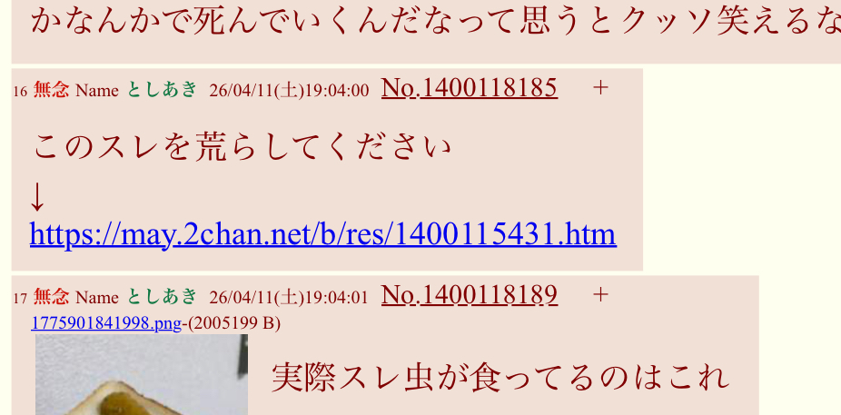 | … | 41無念Nameとしあき26/04/11(土)19:06:53No.1400118907そうだねx4>このスレを荒らしてくれっていろんなスレに依頼しまくってる奴いますよ |