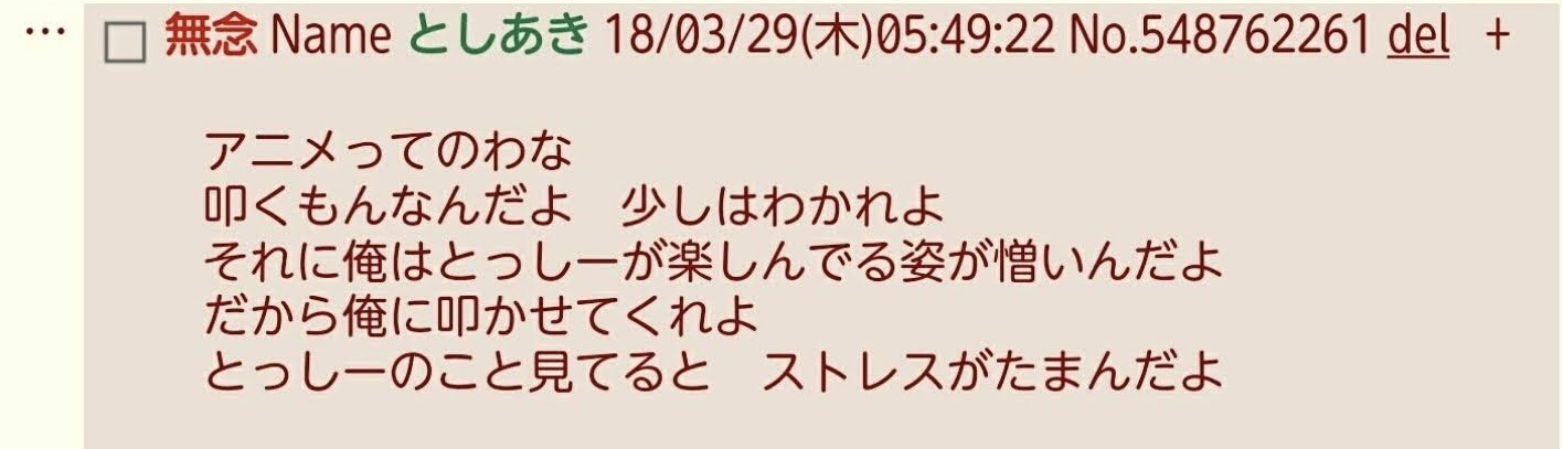 | … | 3無念Nameとしあき26/04/11(土)18:55:03No.1400115855そうだねx37伸びてるアニメとか漫画のスレはだいたい叩きスレになってる |