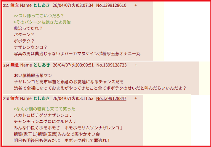 | … | 39無念Nameとしあき26/04/11(土)19:06:28No.1400118801+学マスコピペマンは同一人物?通りすがりのとしあきが面白半分に定型文を書き込んでたりして |