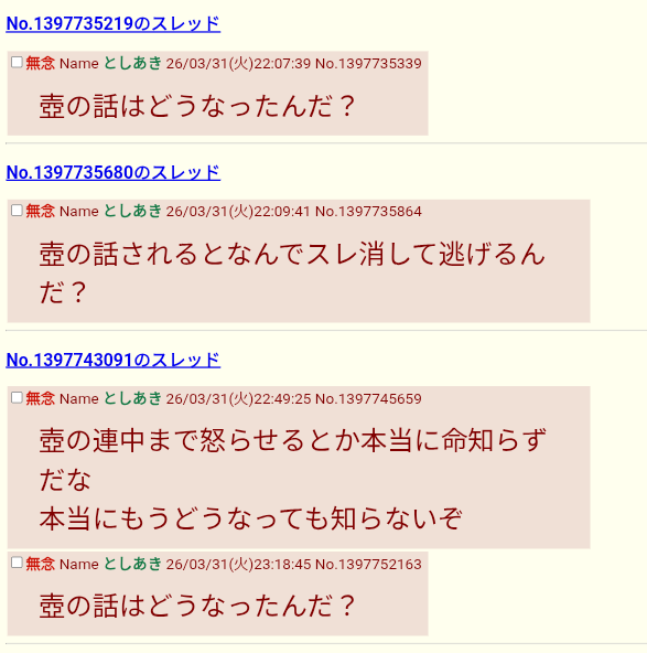 | … | 648無念Nameとしあき26/04/12(日)12:41:31No.1400302998+>>なんか第3勢力の特殊な人まで参戦してきていよいよカオスになってきた |
