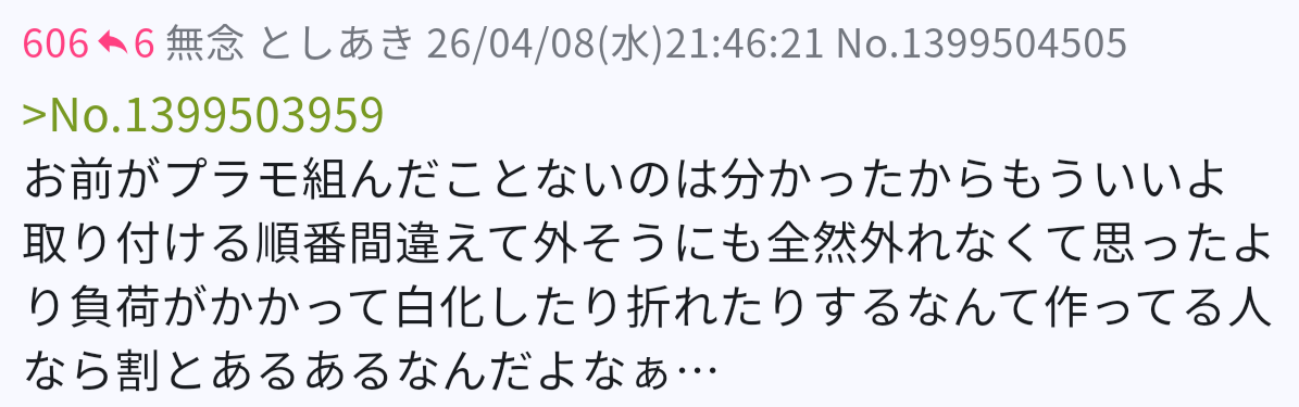 | … | 91無念Nameとしあき26/04/12(日)08:45:11No.1400249631+いい年こいたオッサン共がガンプラ如きに拘る理由とは |