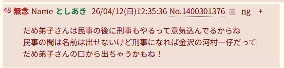 | … | 74無念Nameとしあき26/04/12(日)08:37:53No.1400247975そうだねx7>マジで起訴近いのわかった |