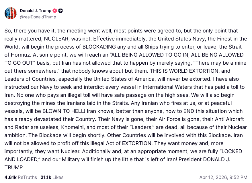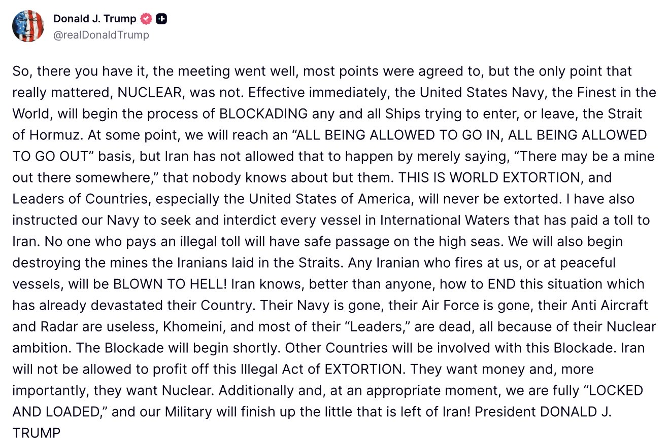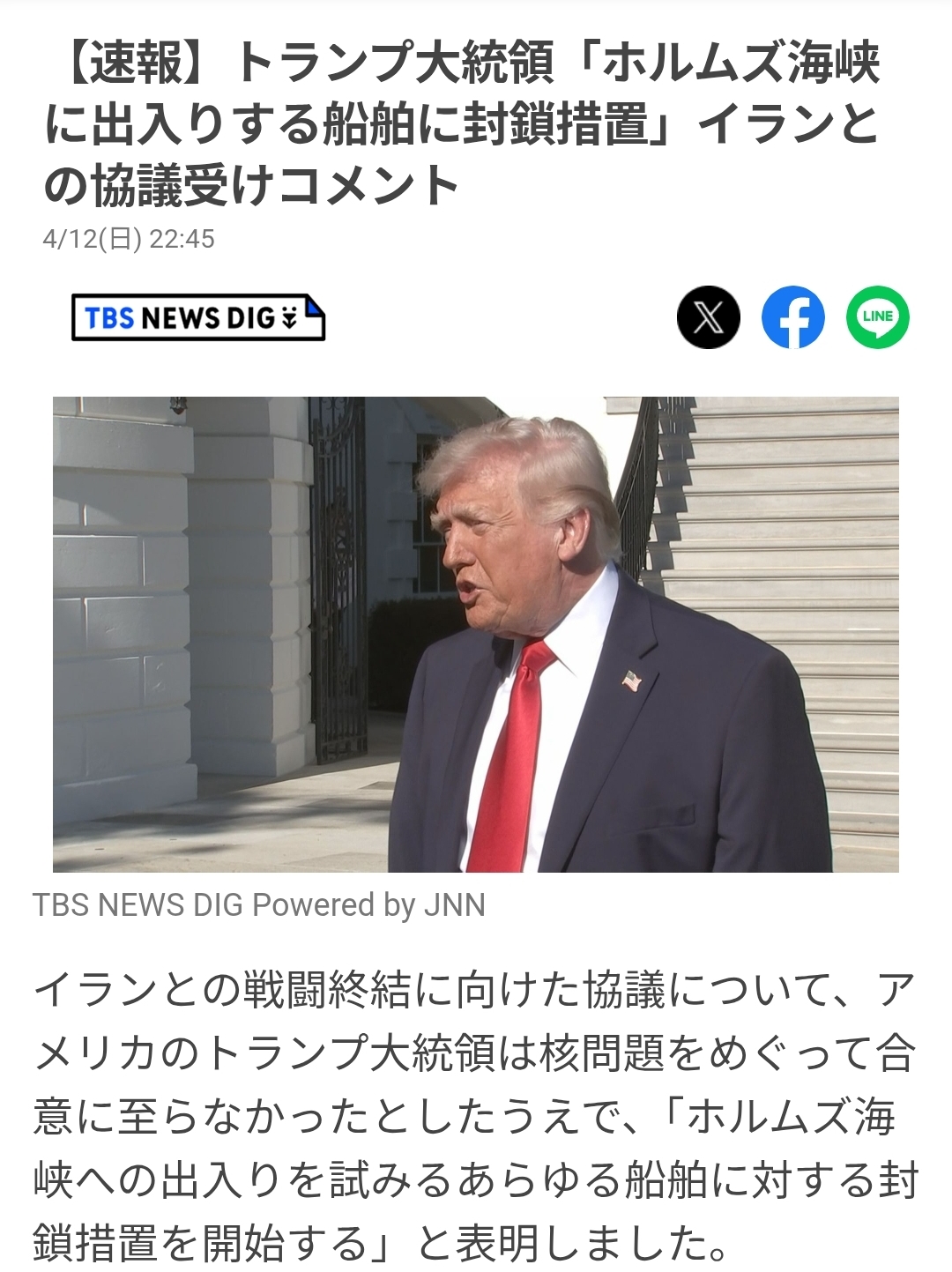 トランプ大統領は先ほど、SNSに「イランが譲歩しない場合の次のカードは海上封鎖」とのメッセージを投稿しました。