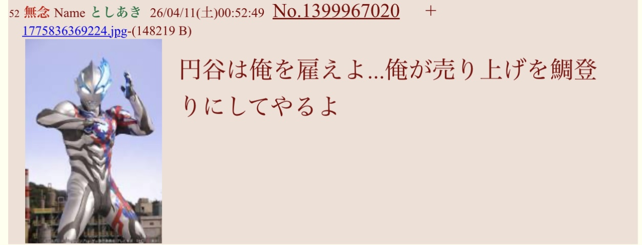 | … | 26無念Nameとしあき26/04/13(月)01:24:59No.1400498882+>あいよ鯛登り! |