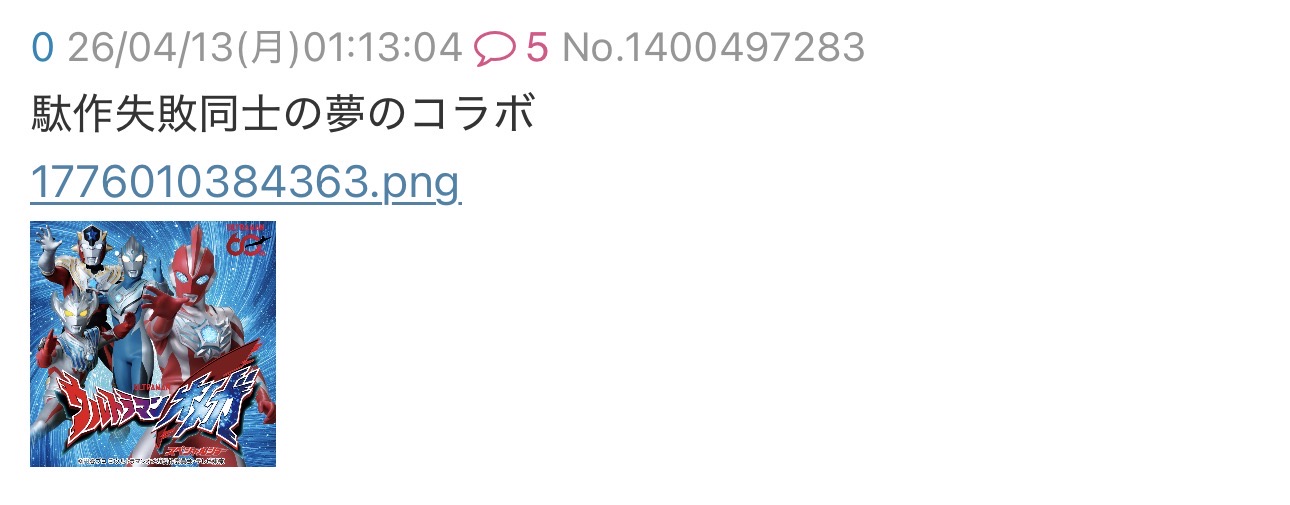 | … | 2無念Nameとしあき26/04/13(月)01:15:02No.1400497544そうだねx5>駄作失敗同士の夢のコラボ |