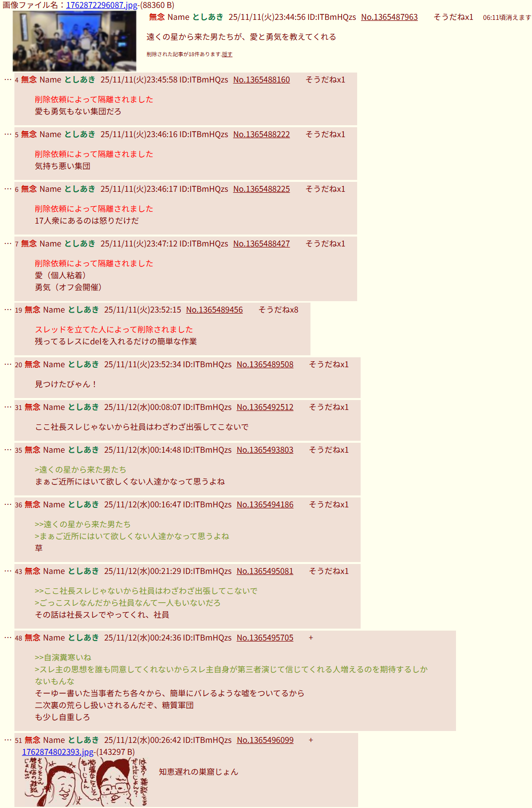 | … | 51無念Nameとしあき26/04/13(月)01:32:58No.1400499772+毎度毎度逃げるくらいなら最初から立てるなクソボケ |