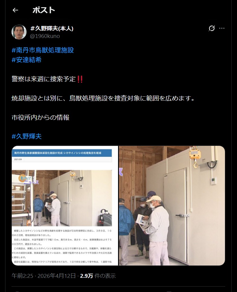 | … | 115無念Nameとしあき26/04/13(月)06:56:54No.1400514199+『南丹市野生鳥獣捕獲個体減容化施設』 |
