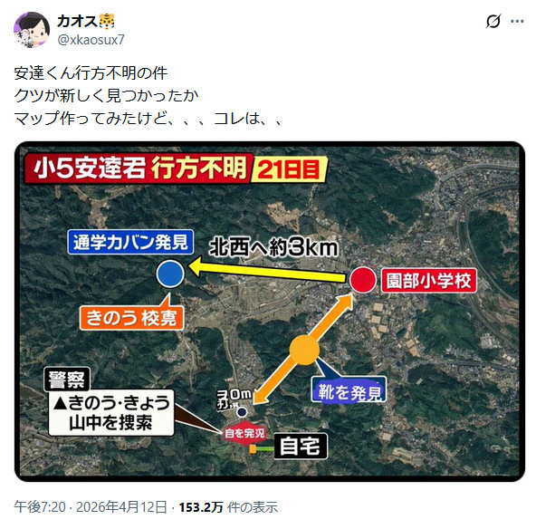| … | 110無念Nameとしあき26/04/13(月)06:53:24No.1400513976+靴は片方ずつ別の山の中に投げ捨てればまだ家出遭難説にできたかもなのに |