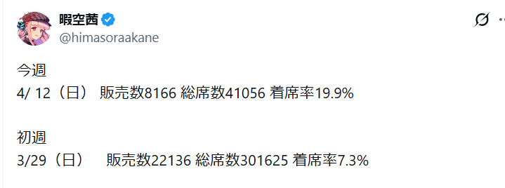 | … | 14無念Nameとしあき26/04/13(月)07:19:17No.1400515712そうだねx2 1776032357518.jpg-(194555 B) >>初週と比較して着席率は着実に上昇し、満席となる回が出てきました |