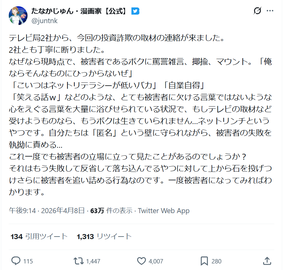 | … | 38無念Nameとしあき26/04/13(月)10:46:02No.1400536371+被害者叩きが詐欺師を利する愚かな行為なのは違いないけど |