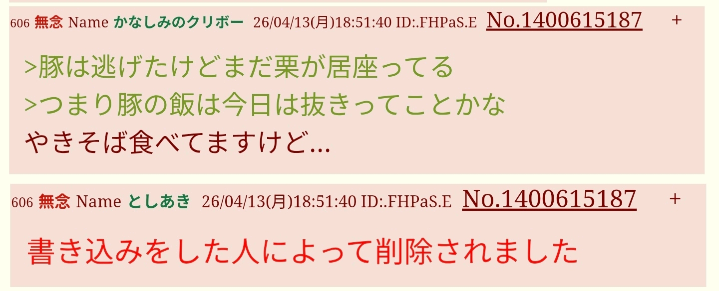 | … | 771無念Nameとしあき26/04/13(月)19:51:58No.1400632108+>豚が貼ってた |