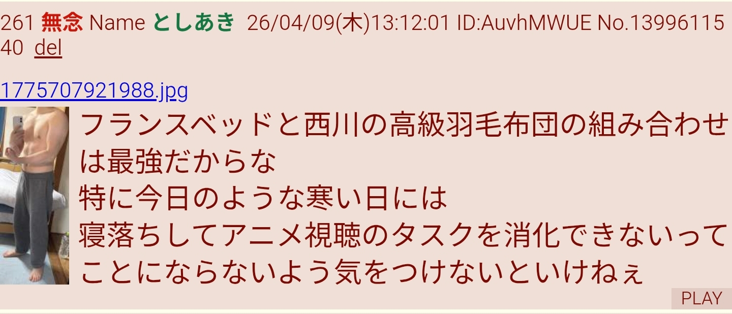 | … | 711無念Nameとしあき26/04/13(月)19:17:03No.1400621914+>いつだったか西川布団とか言わなくなったなってレスしたら思い出したように言い始めたし |
