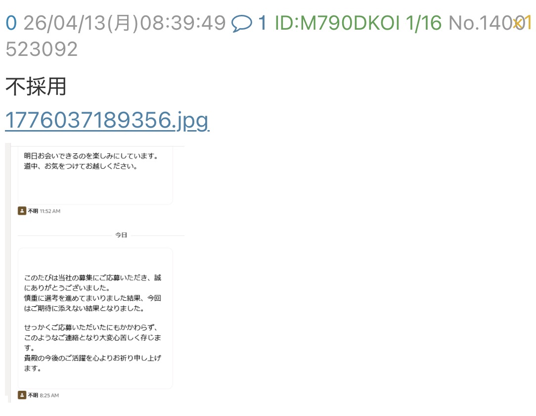 | … | 59無念Nameとしあき26/04/13(月)17:59:41No.1400604676そうだねx3 1776070781488.jpg-(219899 B) >しかし面接すらさせてもらえないって本当にふざけた会社だな |