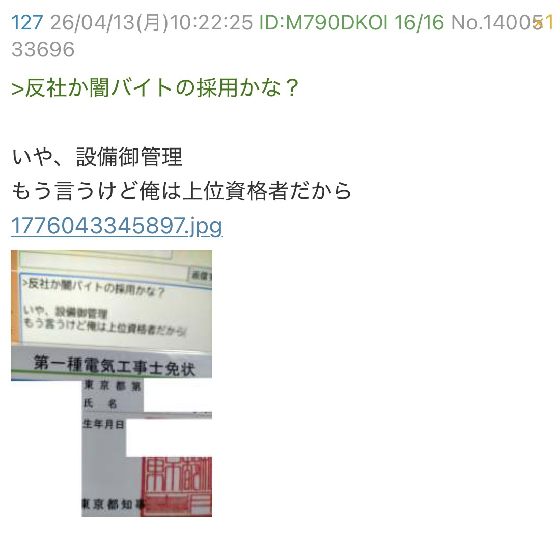| … | 731無念Nameとしあき26/04/13(月)19:27:16No.1400624814+>消防設備士は豚の経歴的には取れない事が早々にバレてたよな |