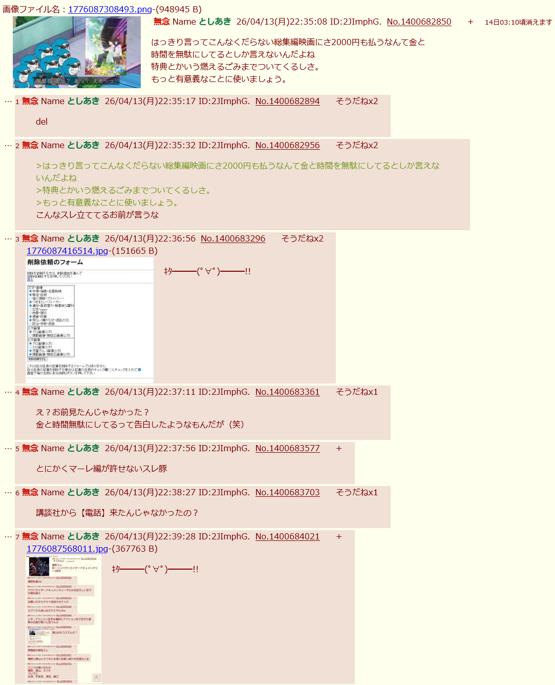 | … | 2無念Nameとしあき26/04/13(月)22:35:32 ID:2JImphG.No.1400682956そうだねx3>はっきり言ってこんなくだらない総集編映画にさ2000円も払うなんて金と時間を無駄にしてるとしか言えないんだよね |
