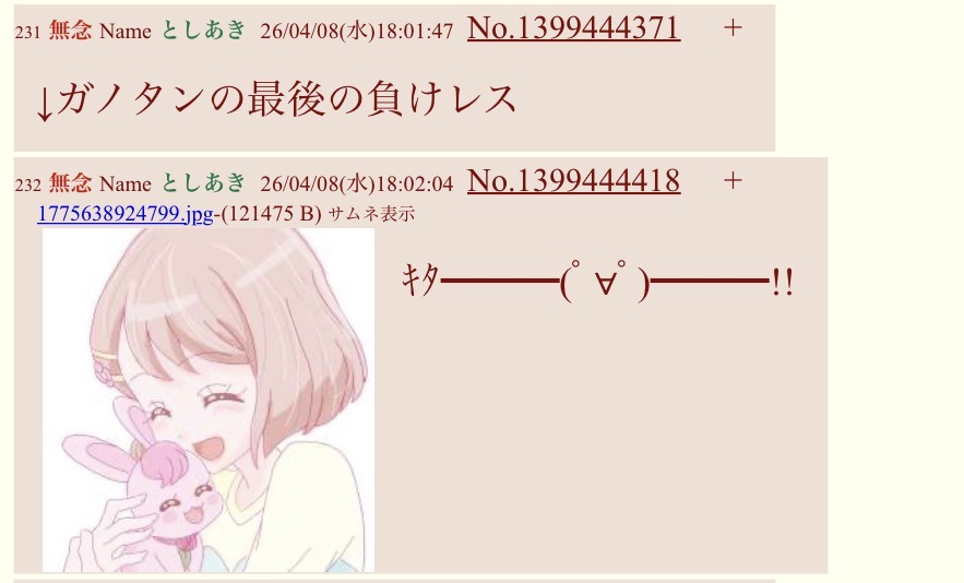| … | 268無念Nameとしあき26/04/14(火)14:06:49No.1400790608そうだねx5>>キリ番しか楽しみの無い健全と支援者🤭 |