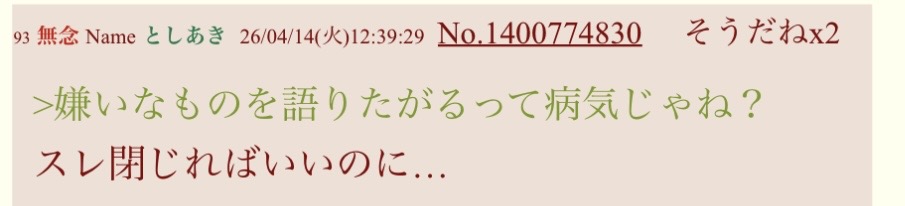 | … | 323無念Nameとしあき26/04/14(火)14:58:29No.1400798236+なんだか一匹だけ障害者が必死だな |