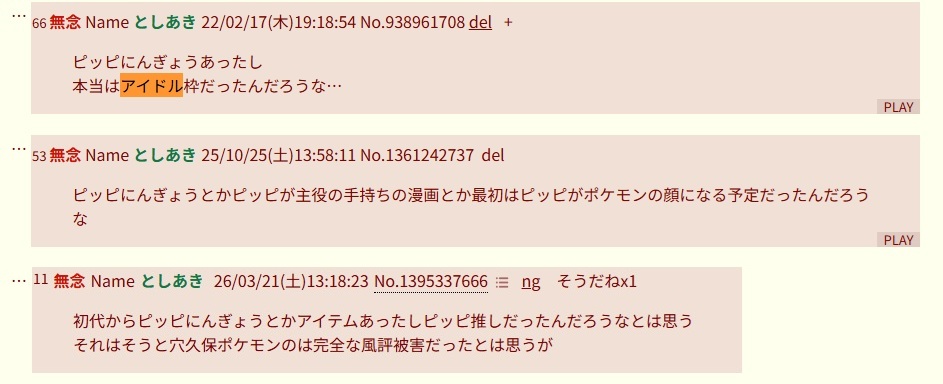 | … | 25無念Nameとしあき26/04/14(火)21:30:19No.1400888654+ピカチュウなんぞが出しゃばらなければポケットモンスターピッピが発売されてたはずなのに… |