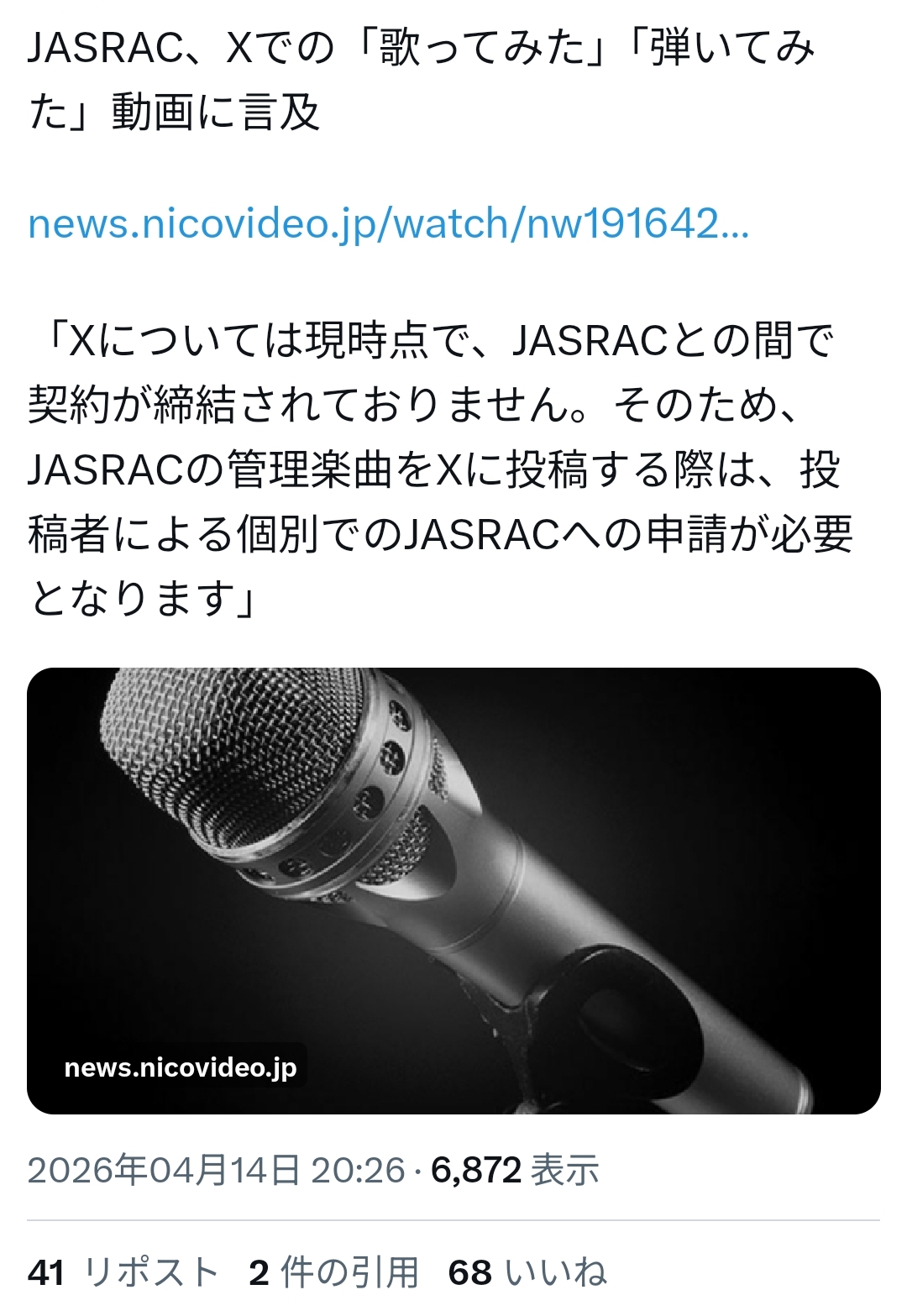 | … | 44無念Nameとしあき26/04/14(火)23:12:39No.1400915774+ニコニコとyoutubeでJASRACの包括契約が結ばれてて色んな曲の歌ってみたを投稿してもお咎め無しなのは知ってたけどTikTokでも結ばれてるのは知らなかった |