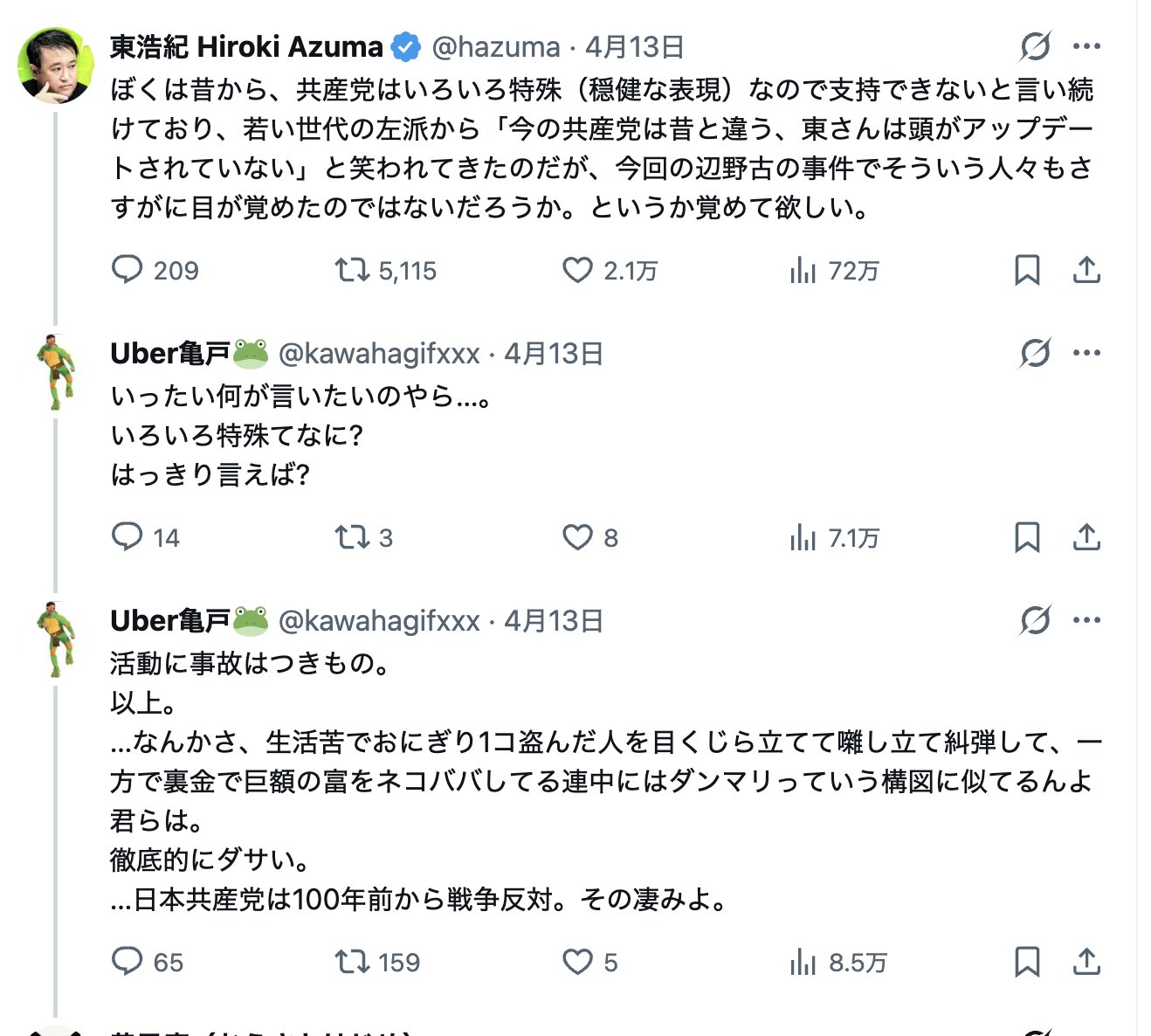 | … | 64無念Nameとしあき26/04/15(水)02:25:00No.1400942895+>実際は共産党この事件前から選挙で大敗し続けてるし嫌われてるしで日本の民主主義って案外うまくいってるんだなって |