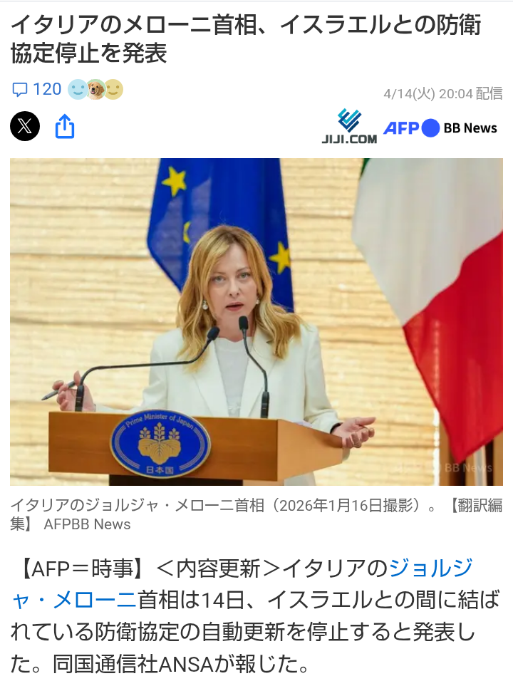 | … | 21無念Nameとしあき26/04/14(火)23:59:48 ID:.3DMrXHsNo.1400926122そうだねx16 1776178788632.jpg-(133115 B) イタリアのジョルジャ・メローニ首相がイスラエルとの軍事協定停止を発表ので |