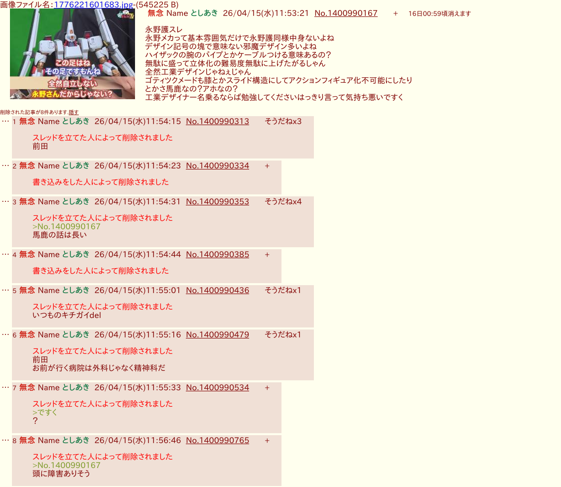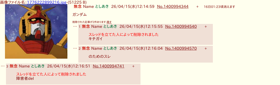 | … | 28無念Nameとしあき26/04/15(水)12:30:22No.1400997655+ 1776223822082.png-(192402 B) ガノタは自分の気に入らないレスは直ぐ削除するからよ… |
