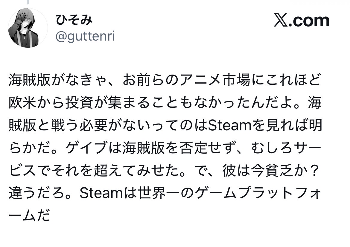 | … | 91無念Nameとしあき26/04/15(水)12:23:07No.1400996119そうだねx2海賊版のおかげで日本のゲームは海外に広まったとかいうアホ外人が売上を確認してるゲーム作者に論破されてた |