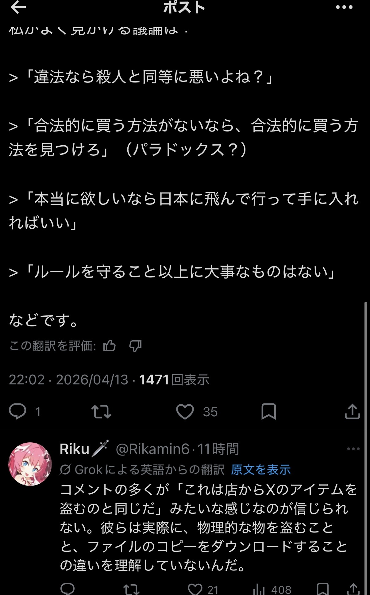 | … | 67無念Nameとしあき26/04/15(水)12:16:41No.1400994702そうだねx6 1776223001198.png-(449427 B) >>海賊版やってるやつらは外人のなかでもクズ扱いだぞ |