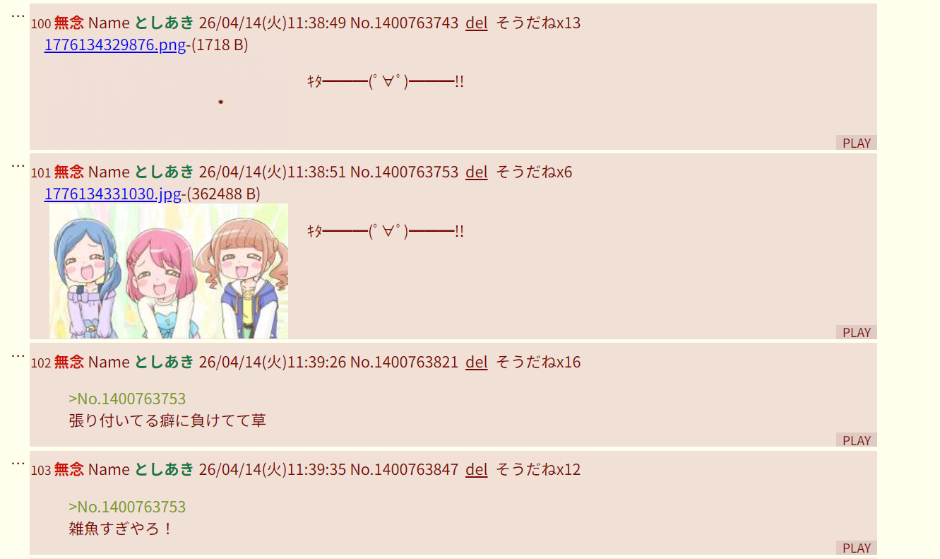 | … | 144無念Nameとしあき26/04/15(水)15:42:18No.1401032348そうだねx4>>正直、「こいつでもプリキュアとかわかるんだなあ」と思った |