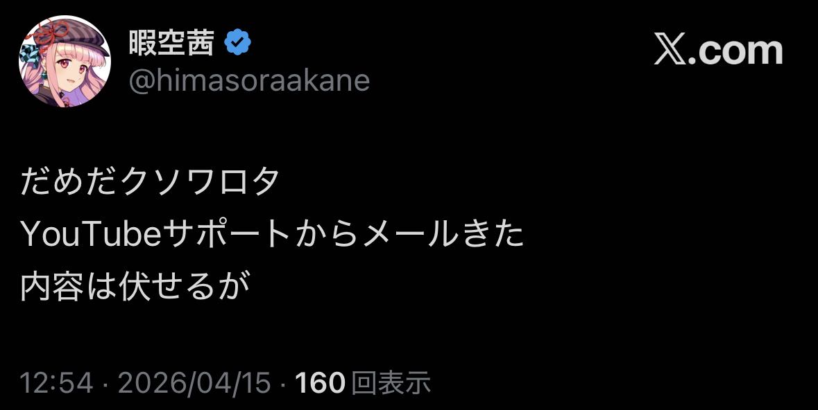 | … | 15無念Nameとしあき26/04/15(水)13:03:53 IP:106.146.*(au-net.ne.jp)No.1401005364そうだねx4DMCAした側にもYoutubeからお問い合わせメール行ってそう |