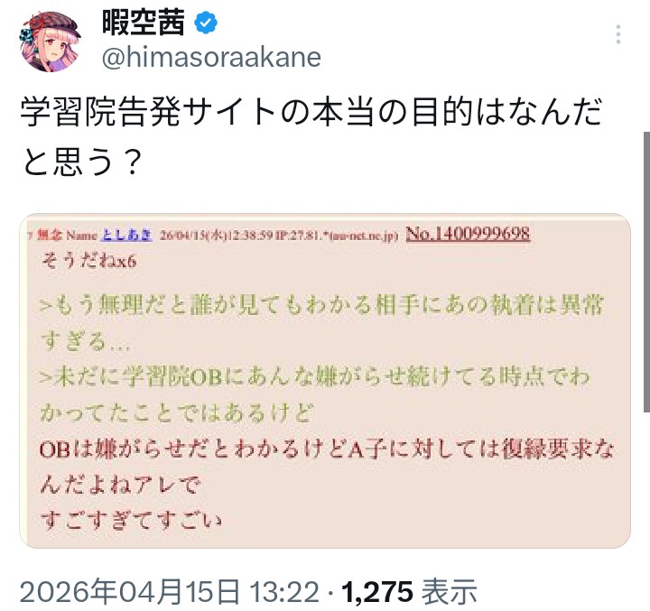 | … | 17🐼Nameとしあき26/04/15(水)13:10:15 IP:175.132.*(dion.ne.jp)No.1401006634+>OBについても案外「私と再び私の望むような交友関係を修復しなさい」でやってるのかもしれない… |