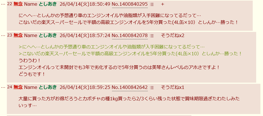 | … | 127無念Nameとしあき26/04/15(水)18:18:42No.1401061080+にへへ…としんかがエンジンオイル不足を予想して3月の楽天スーパーセールで10缶確保したのを昨日馬鹿にしたとしんかたちは頭月岡さん… |