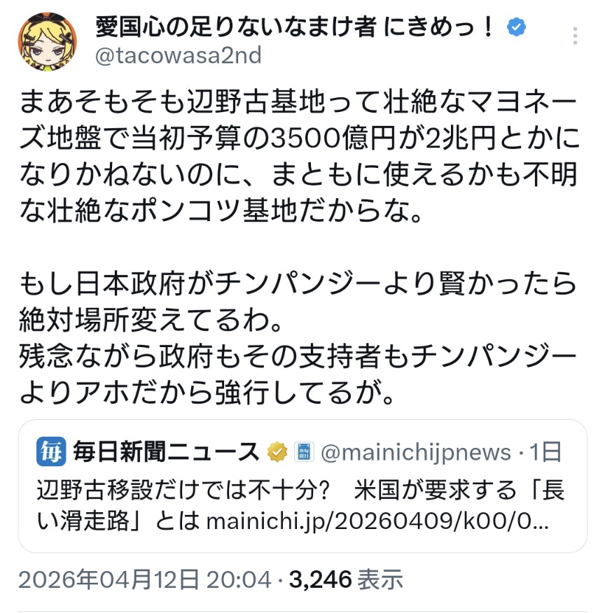 | … | 93無念Nameとしあき26/04/15(水)17:15:35No.1401048622そうだねx1>辺野古決めたの国会議員の多数だから逆らっちゃだめなんじゃ? |