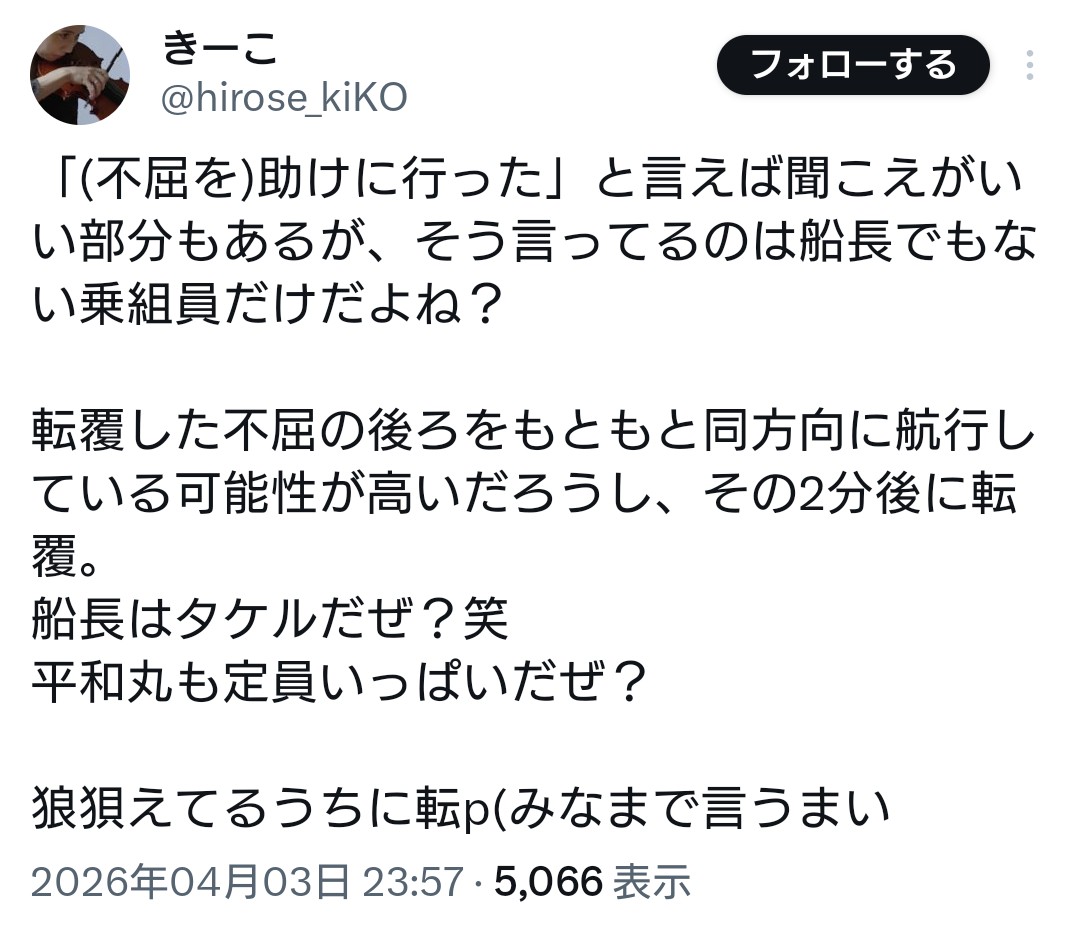 | … | 907無念Nameとしあき26/04/15(水)19:19:39No.1401076513+普通に平和丸の船長は業務上過失致死よね |