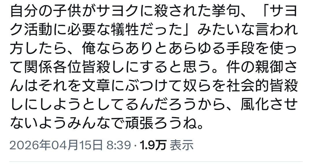 | … | 998無念Nameとしあき26/04/15(水)19:38:19No.1401081897+>亡くなった子の親御さんのnoteは大丈夫なんかね |