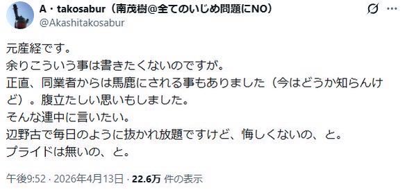 | … | 4無念Nameとしあき26/04/15(水)16:46:26No.1401043107そうだねx45腐ってないのは産経だけ |