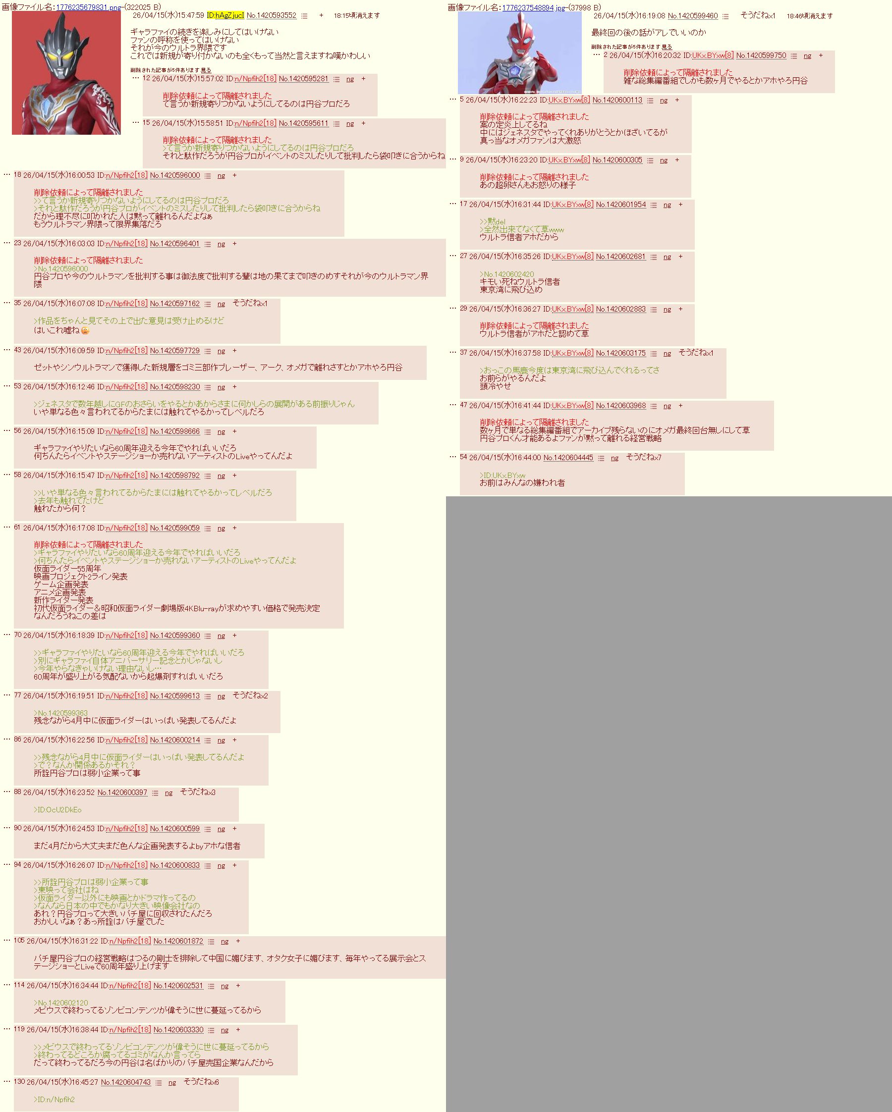 | … | 14無念Nameとしあき26/04/15(水)18:26:01No.1401062732+https://img.2chan.net/b/res/1420623188.htm |