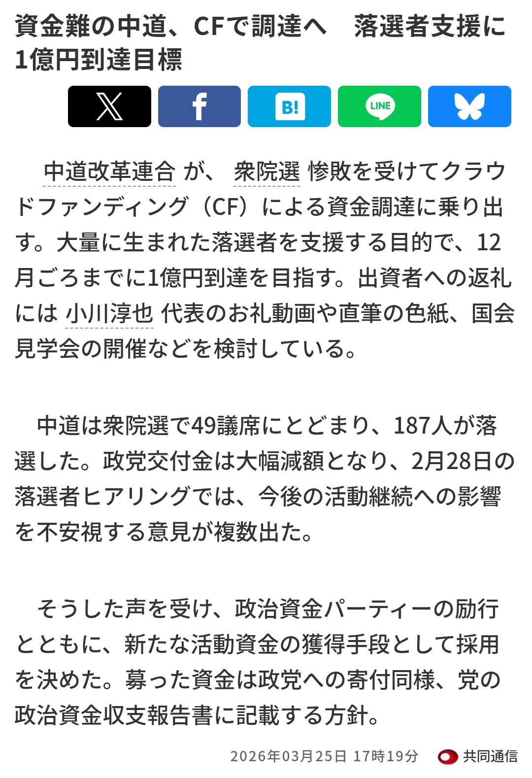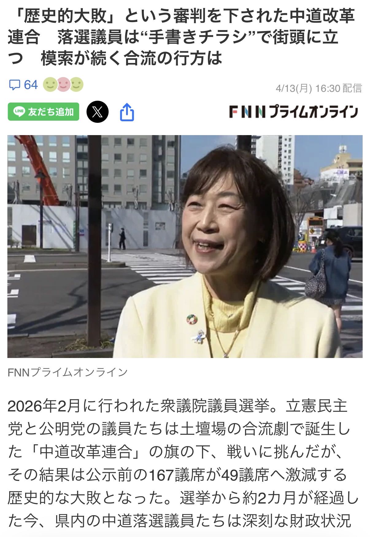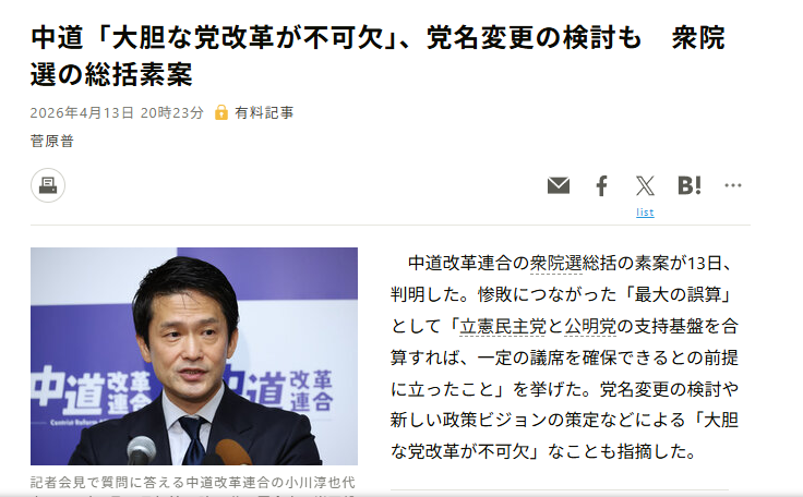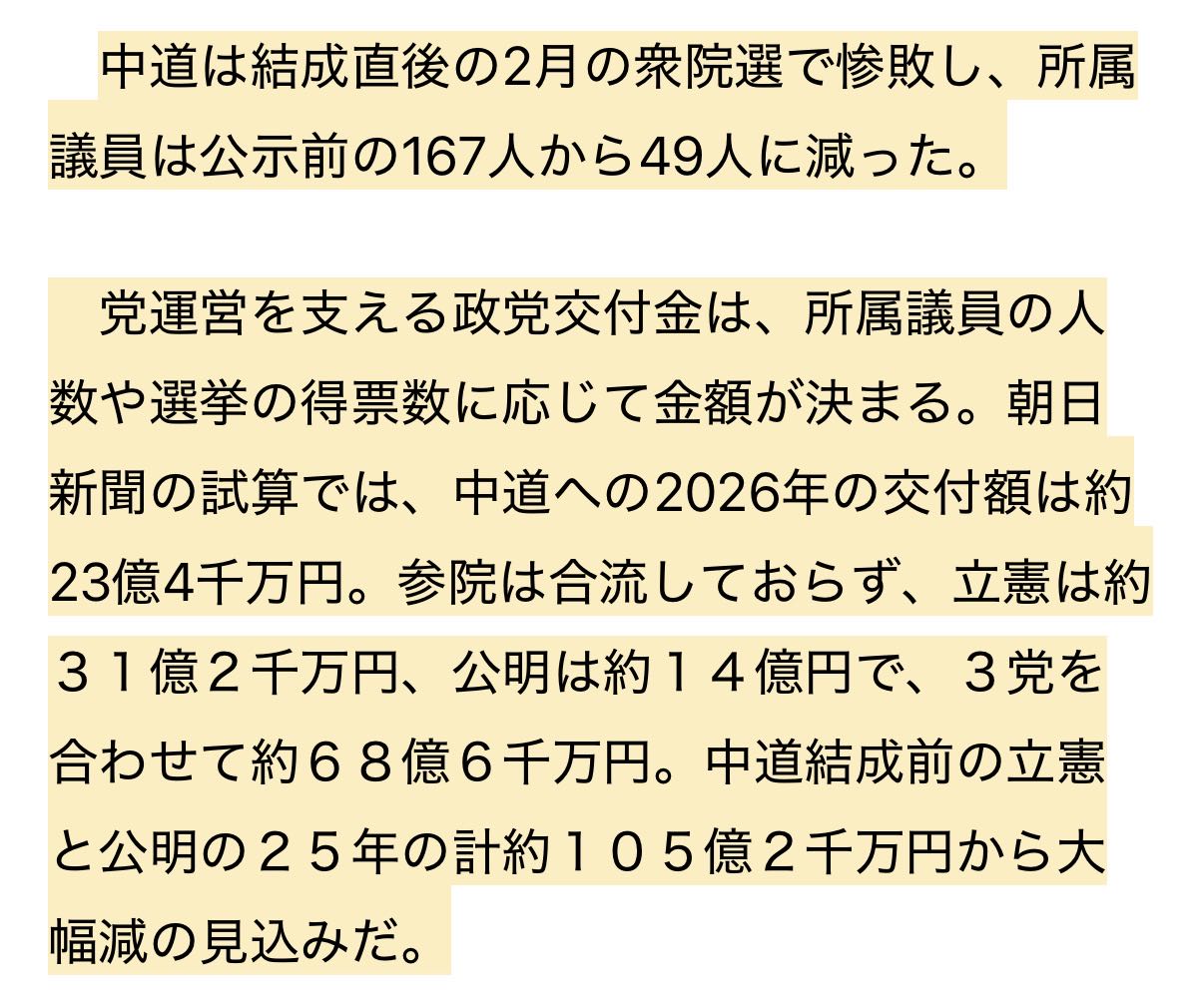 | … | 2無念Nameとしあき26/04/15(水)18:22:48No.1401062003そうだねx1中道、落選者に「活動支援金」月40万円支給へ 対象はまず約30人 |