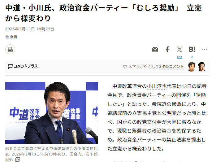 | … | 73無念Nameとしあき26/04/15(水)18:39:52No.1401065926+選挙前まで中道議員だった人いわく他党はここで言えないぐらいもっとカネに汚いことばっかしてるそうだ |