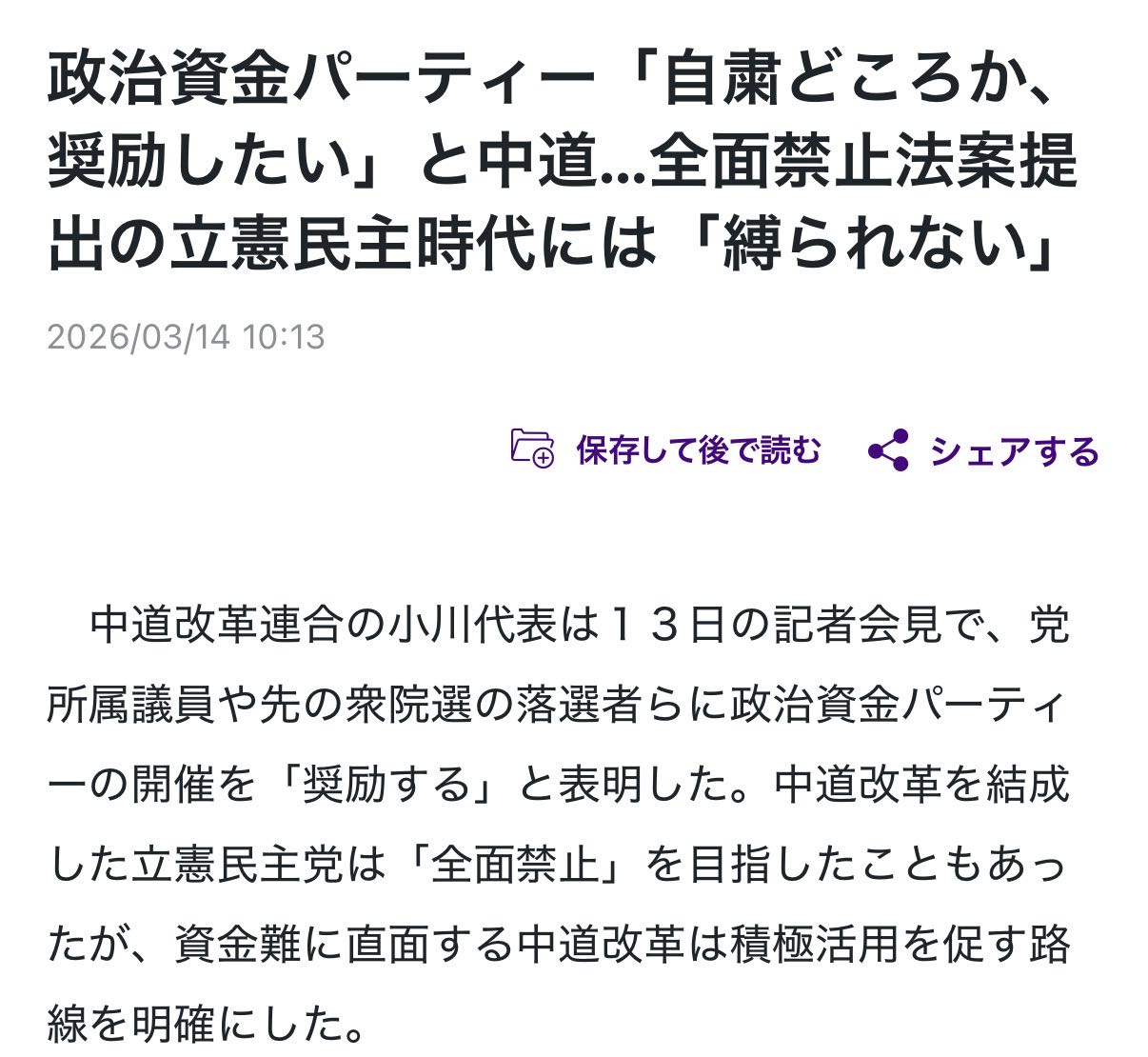 | … | 21無念Nameとしあき26/04/15(水)18:28:48No.1401063394+>「政党交付金は、政党の政治活動が特定の企業団体の意向にゆがめられることを避けるため、民主主義のコストとして国民の皆さんからいただいた税金で賄われています」 |