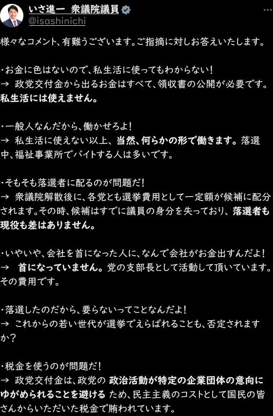 | … | 37無念Nameとしあき26/04/15(水)18:33:28No.1401064503+> 伊佐議員は15日にXでこの話題に言及し、「何度も言いますが、『私生活には使えません』」と今回の支援金について説明。「あくまで秘書とか事務所とか車とか、政治活動にしか使えないもの」とした。 |