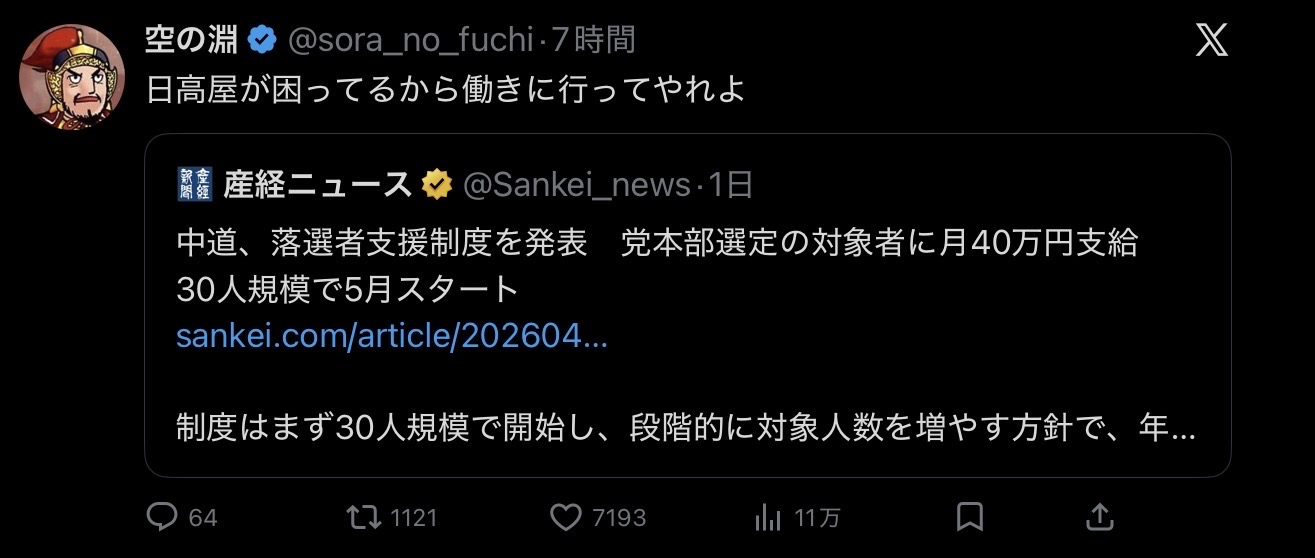 | … | 486無念Nameとしあき26/04/15(水)22:01:02No.1401126187+>政党助成金を落選者に配るのって普通に犯罪じゃねえかこれ? |