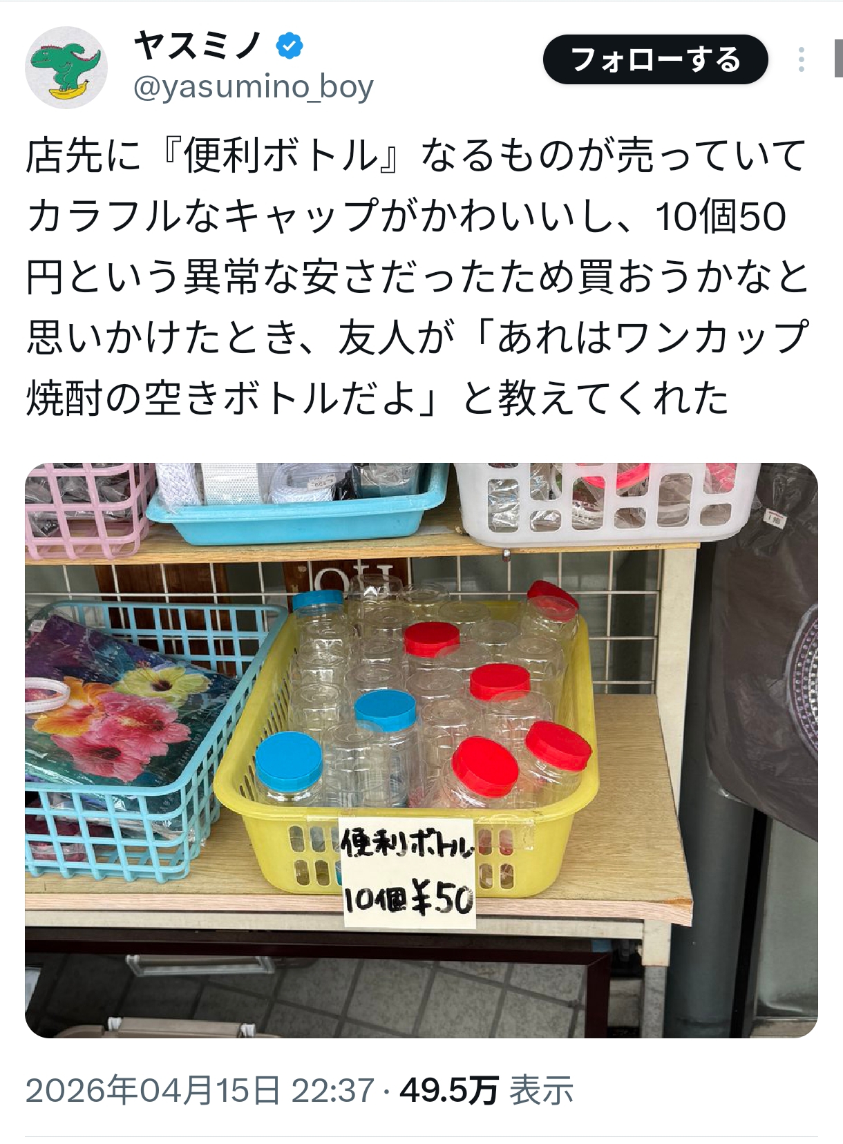 | … | 138無念Nameとしあき26/04/16(木)00:56:39No.1401169050そうだねx4>瓶自体はいろんなのが使えるだろうけど |