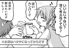 | … | 34無念Nameとしあき26/04/15(水)22:00:54No.1401126139+ 1776258054105.jpg-(30664 B) ひだまりもお酒を飲むシーンを定番にする予定だったのに止められたわ |